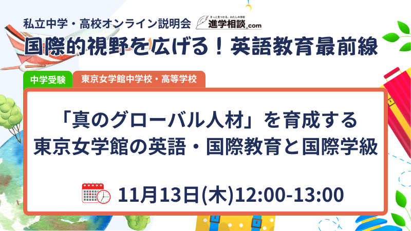 この説明会では、習熟度別で4技能をバランスよく身につける英語の授業、海外の同世代と英語で交流する海外研修・派遣留学などの国際交流プログラム、これからのグローバル人材に求められる自国文化理解などについて、具体的にご紹介いたします。